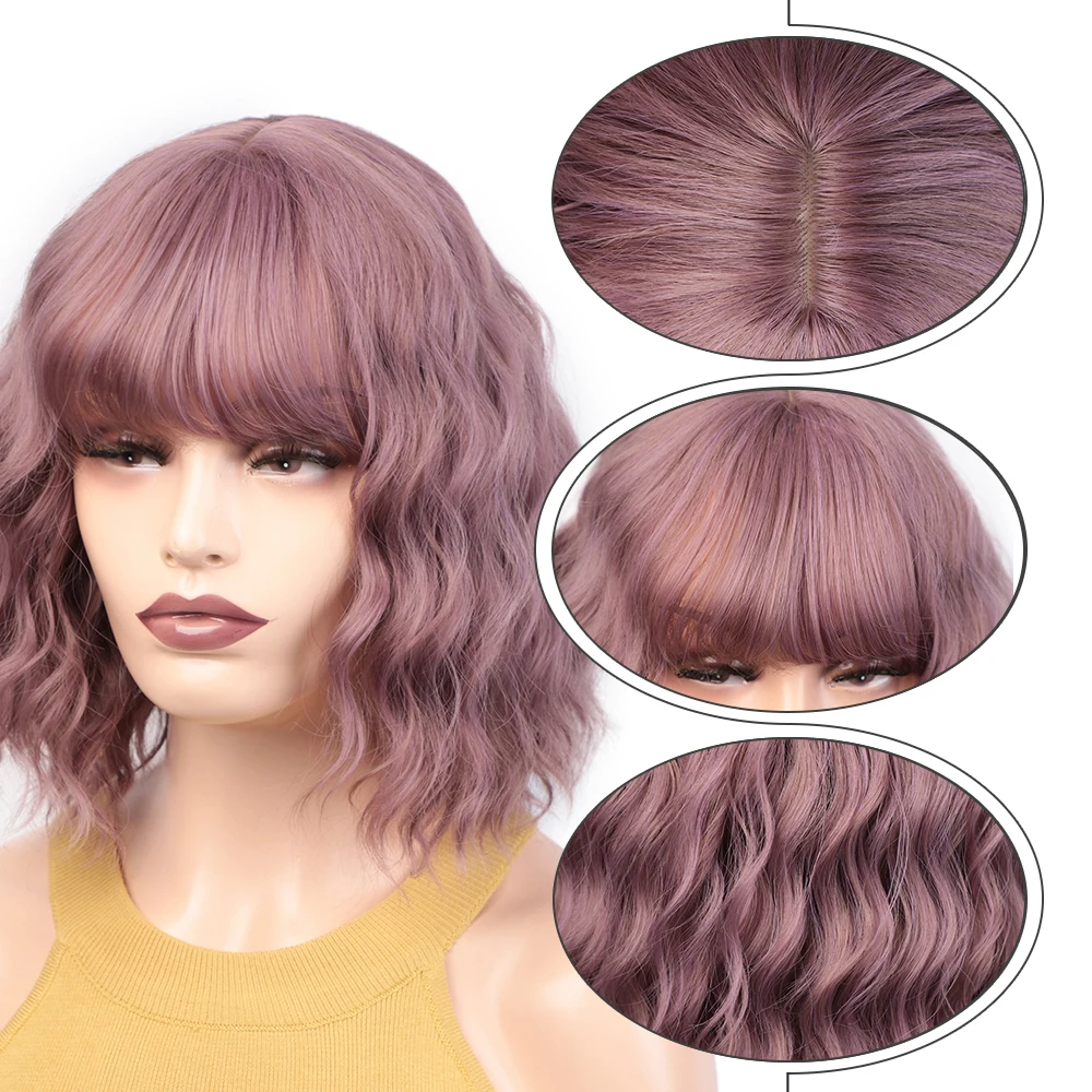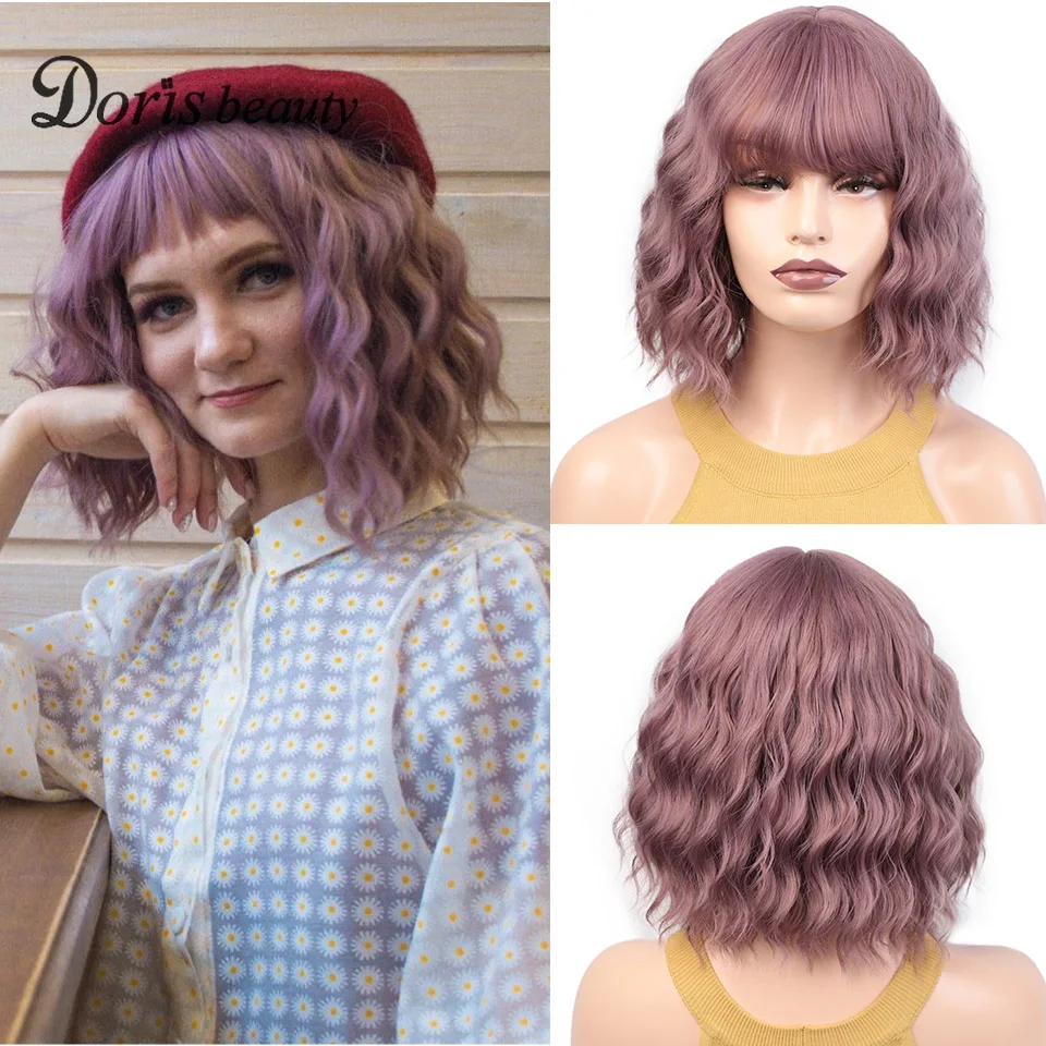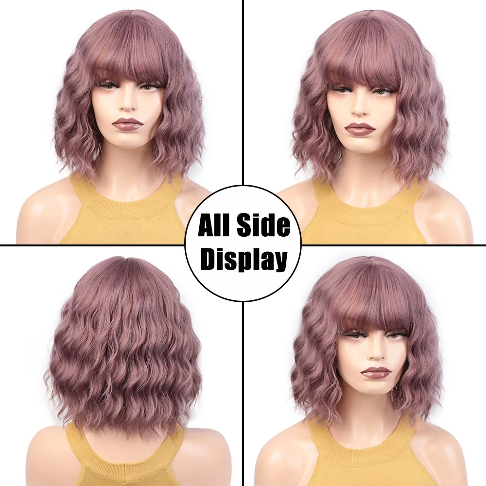 Synthetic Short Pink Wig with Bangs Lolita Wigs for Women Cosplay Water Wave Purple Brown Gray Wig