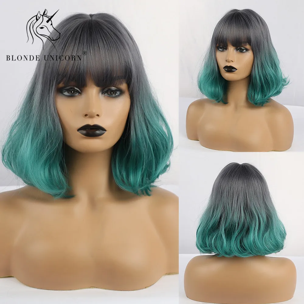 HOT SALE BLONDE UNICORN Synthetic Grey Ombre GREEN 12 Inch Short Wavy Bob Wigs Cosplay Wig for Women High Te