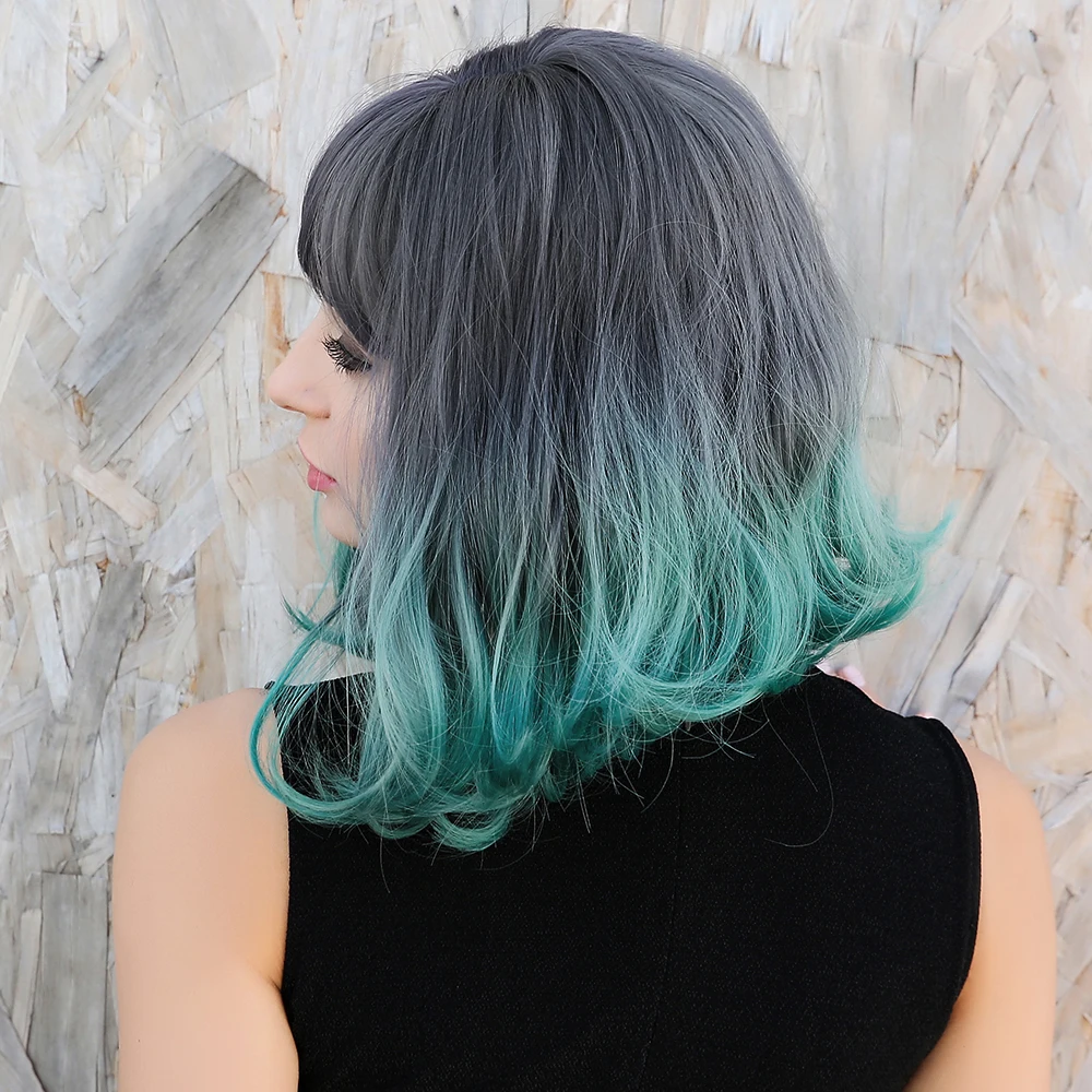 BLONDE UNICORN Synthetic Grey Ombre GREEN 12 Inch Short Wavy Bob Wigs Cosplay Wig for Women High Te