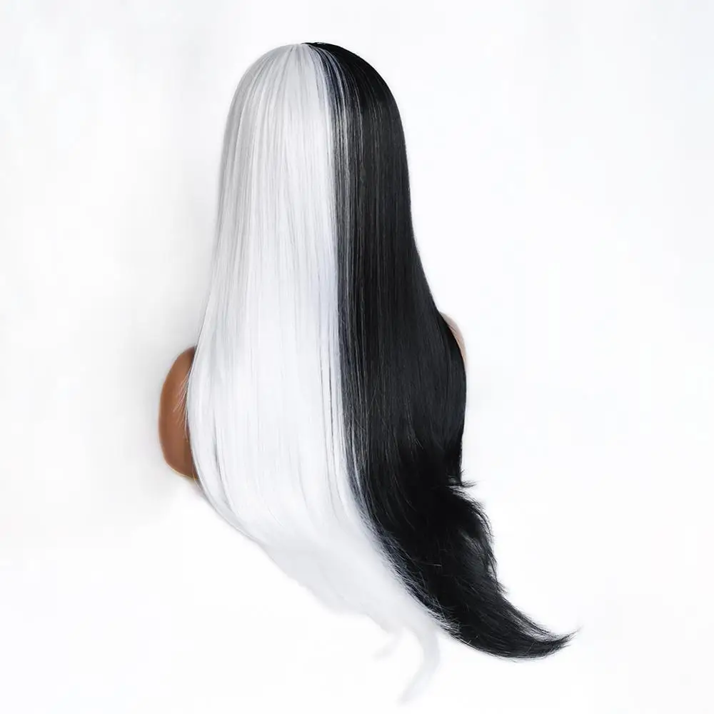 BEST QUALITY FAVE Black/White Half Long Straight Hair High Temperature Fiber Synthetic Wigs Halloween Cosplay Ca